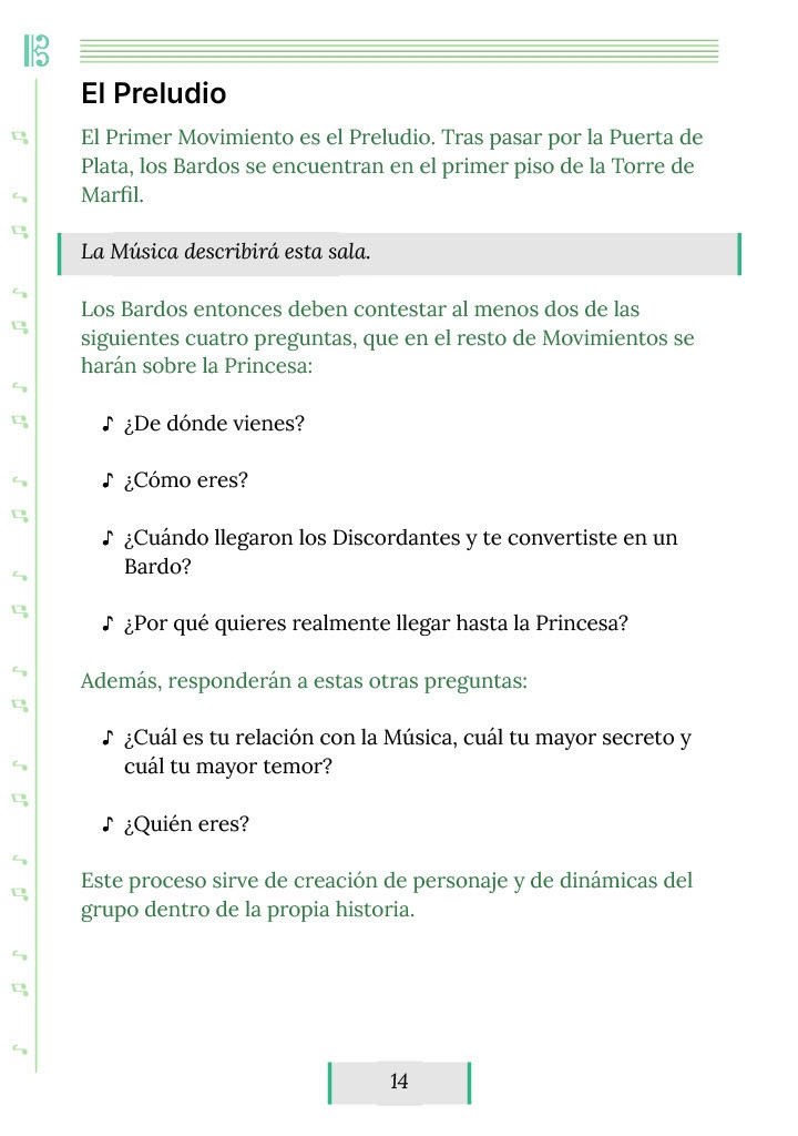 La creación de personajes y El Mundo está integrada en la ficción. El primer Movimiento de la Torre de Marfil requiere que los Bardos se den a conocer. Cada Bardo está descrito respondiendo a las mismas preguntas que deben hacerse sobre la Princesa: ¿De dónde vienes? ¿Cómo eres? ¿Cuándo llegaron los Discordantes y te convertiste en un Bardo? ¿Por qué quieres realmente llegar hasta la Princesa? ¿Cuál es tu relación con la Música, cuál tu mayor secreto y cuál tu mayor temor? ¿Quién eres realmente?
